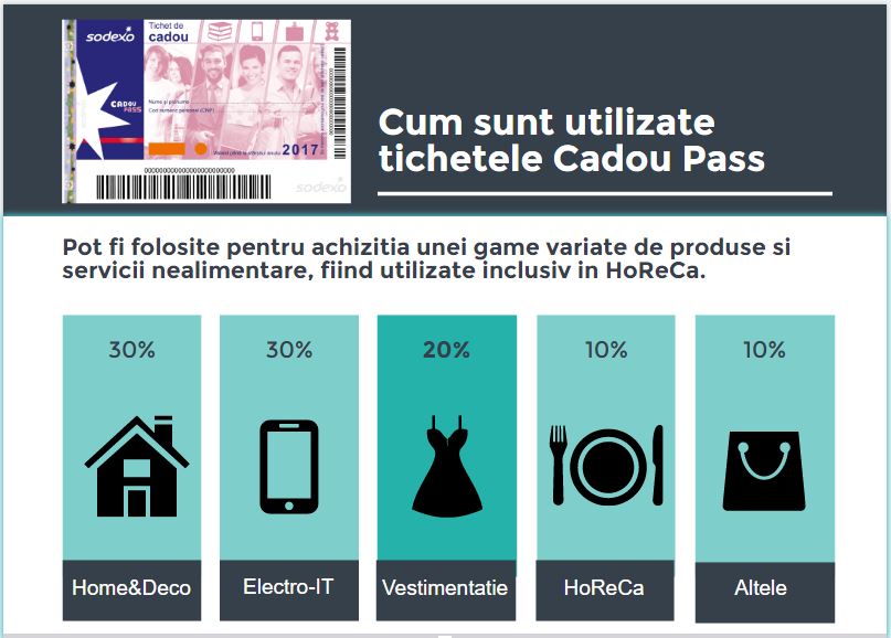 Tichetele Cadou Pass pot fi utilizate pentru achiziția unei game variate de produse și servicii nealimentare, fiind folosite inclusiv în HoReCa. Potrivit analizei Sodexo, angajații le utilizează cu precădere pentru achiziții de: