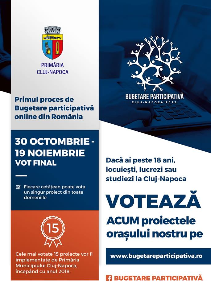 Începând de astăzi, 30 octombrie, proiectele pentru Cluj-Napoca au intrat în etapa de vot final pe www.bugetareparticipativa.ro. În următoarele 3 săptămâni, clujenii vor decide – prin vot online – care sunt cele 15 proiecte pe care Primăria le va implementa începând cu 2018.