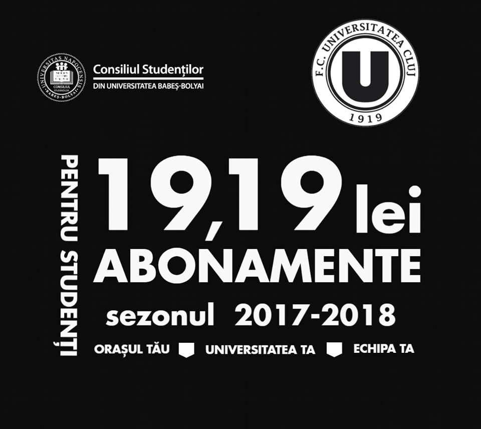 Astfel, dacă eşti student la UBB îţi poţi achiziţiona un abonament pe întreg sezonul la meciurile Universităţii Cluj de pe Cluj Arena la preţul de doar 19,19 lei şi poate fi achiziţionat de la standul clubului din Iulius Mall.
