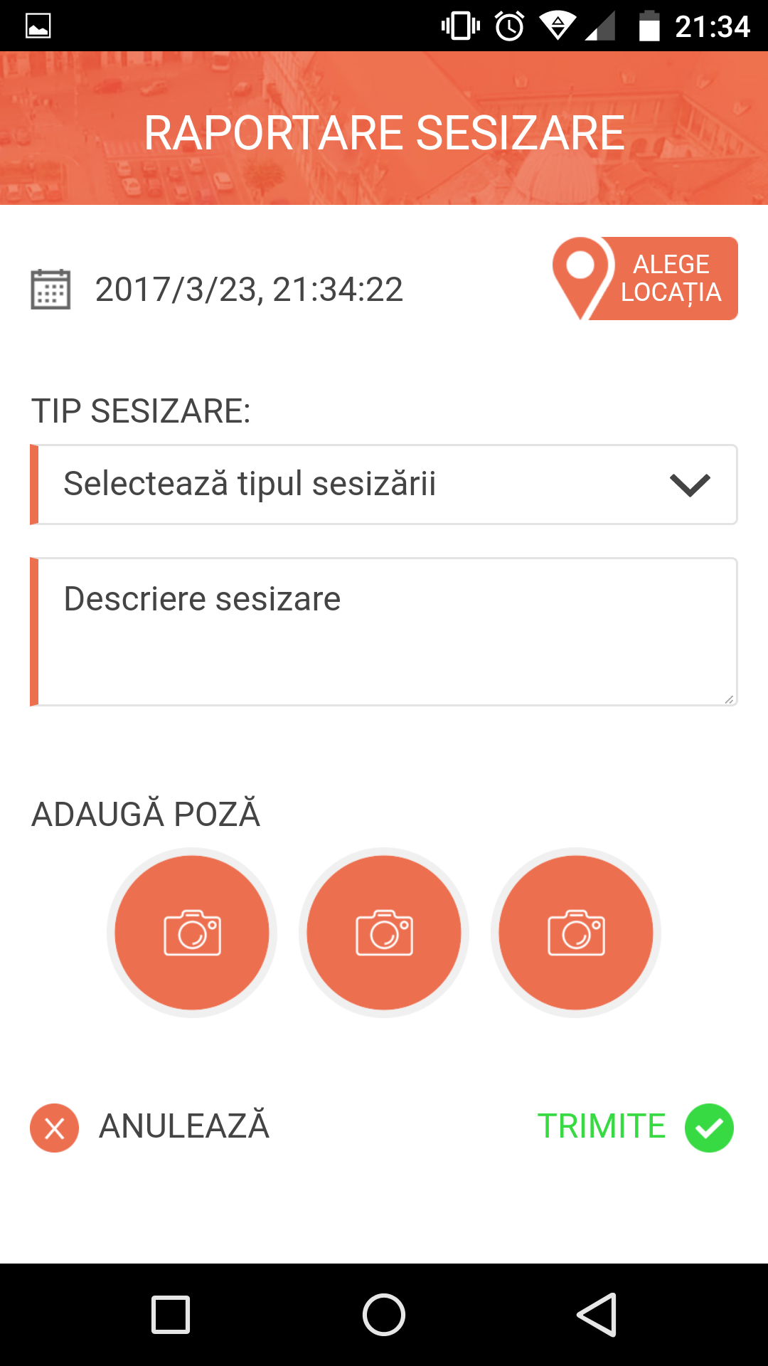 Odată selectată sesizarea dorită, veți putea descrie incidentul și adăuga trei poze, după care va putea fi trimisă, urmând ca reprezentanții primăriei să o analizeze și redirecționeze spre departamentul aferent din cadrul Primăriei Cluj-Napoca.