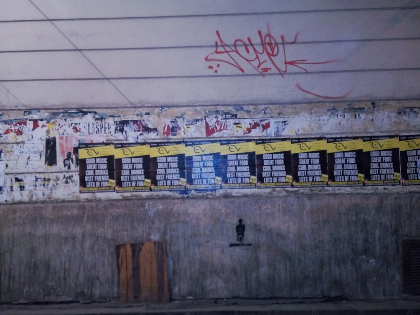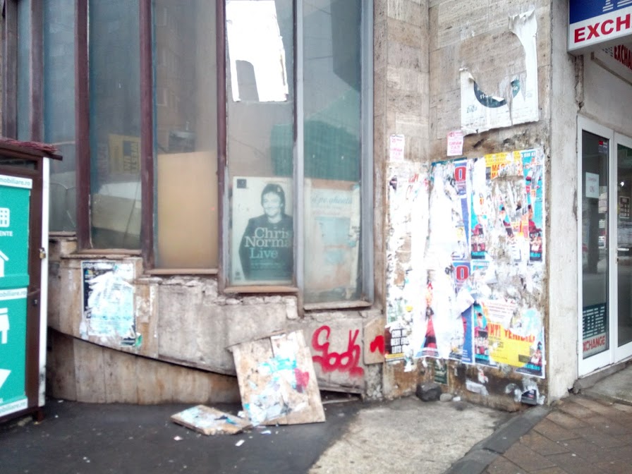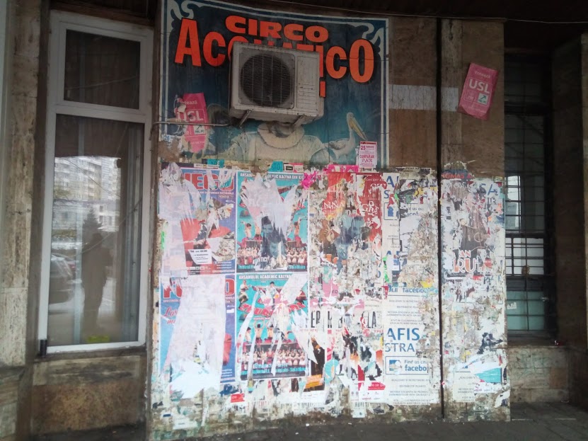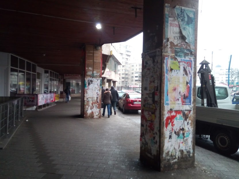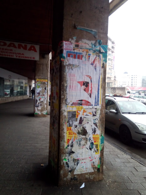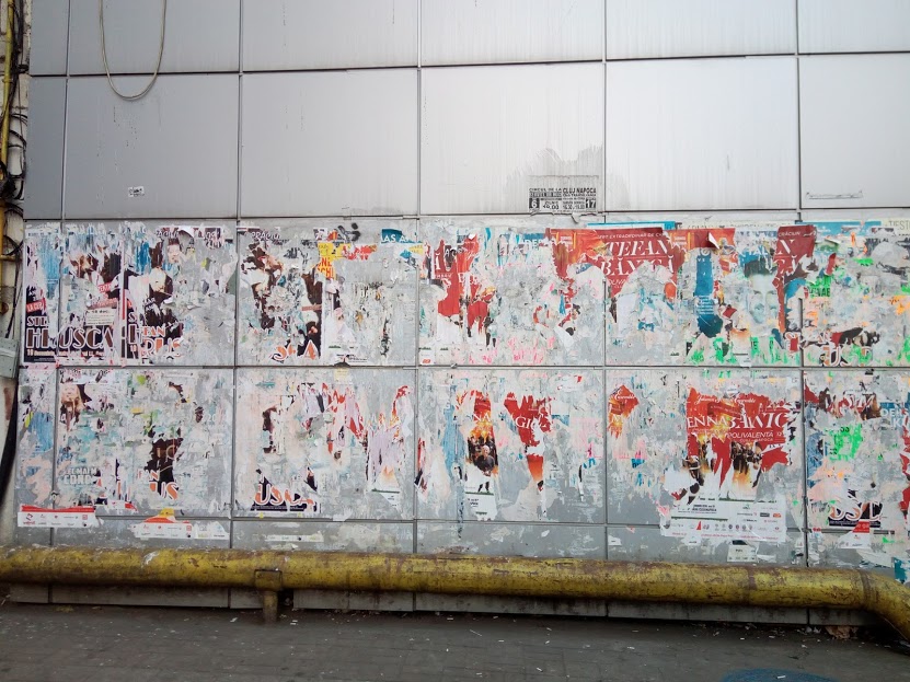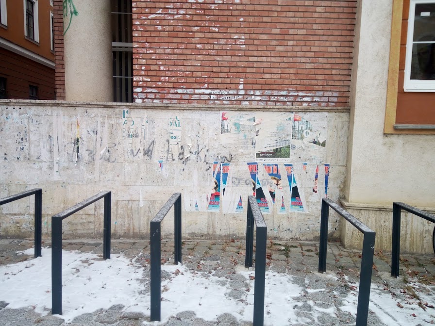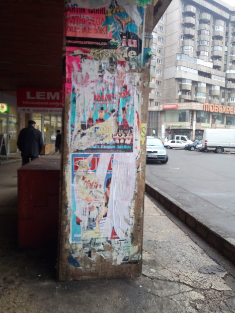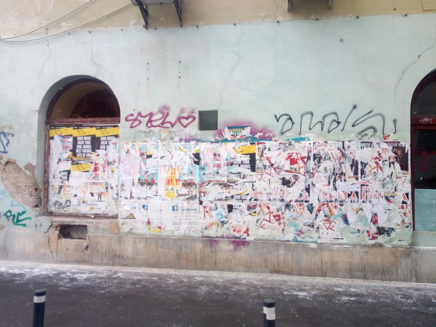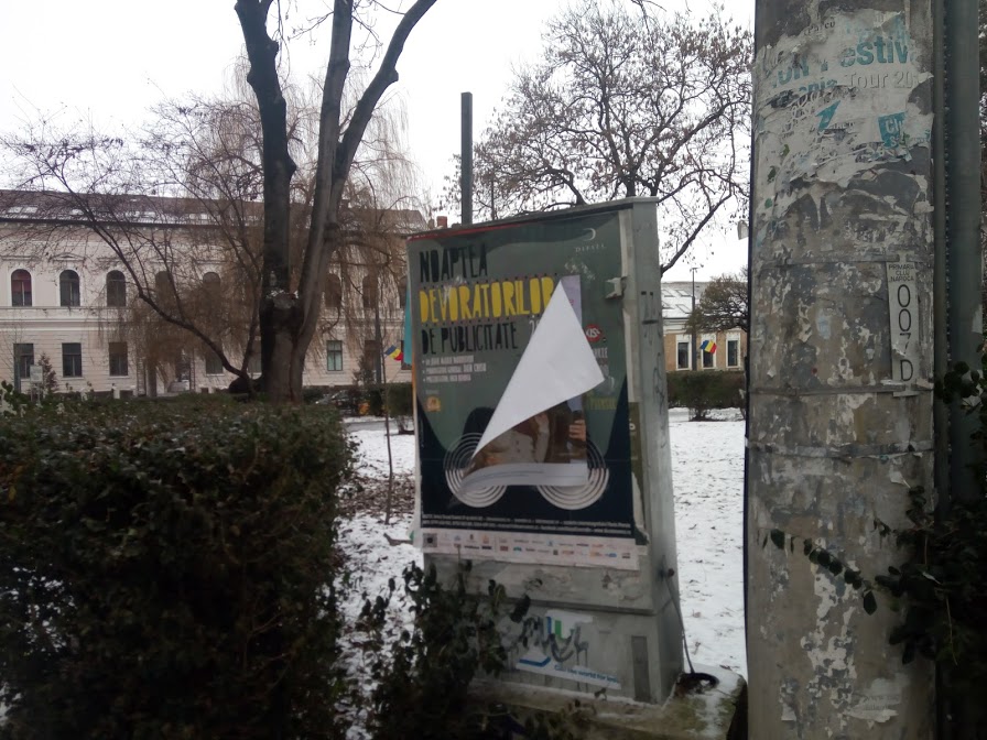 În plin centrul orașului, pe străduța care leagă B-dul 21 Decembrie 1989 de B-dul Eroilor, Bolyai, stau lipite zeci de afișe și urme de afișe.