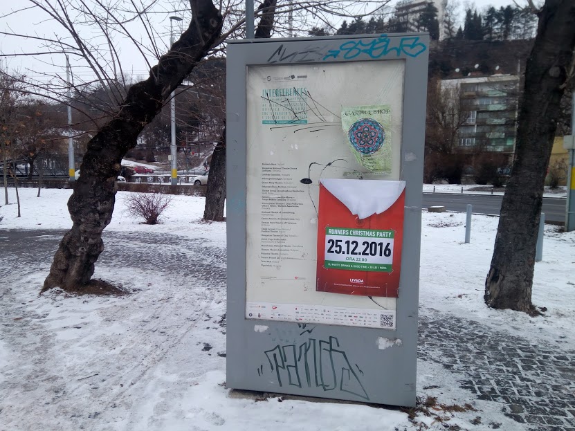Mergem câteva sute de metri și ne oprim în centrul istoric al orașului, Piața Muzeului, unde la câțiva pași de terasele unde oamenii stau vara la povești și cafele, există și un loc dedicat afișajului ilegal, taman în fața rastelului pentru biciclete.