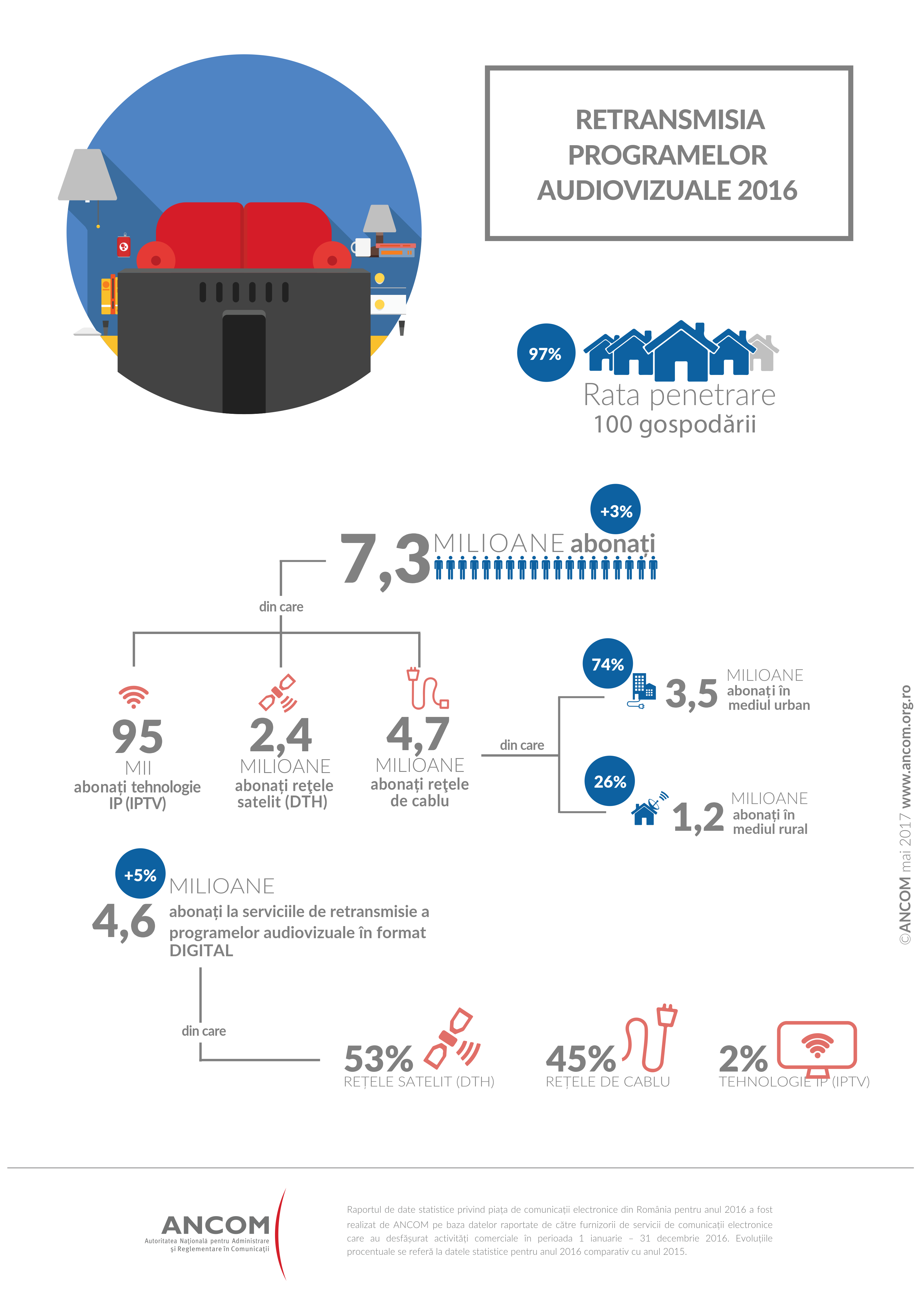 La sfarsitul anului 2016, in Romania, erau aproape 7,3 milioane de abonati la servicii de retransmisie a programelor audiovizuale furnizate contra-cost, in crestere anuala cu 3%, conform datelor raportate de furnizori catre ANCOM. Dintre acestia, peste 4,7 milioane sunt abonati prin retele de cablu, 2,4 milioane sunt abonati prin retele satelit (DTH) si 95 de mii sunt abonati prin tehnologie IP (IPTV). Numarul de abonati care receptioneaza servicii de retransmisie a programelor audiovizuale prin cablu in format digital a crescut cu mai mult de 10% la sfarsitul anului 2016 fata de 2015. Infografic aici.