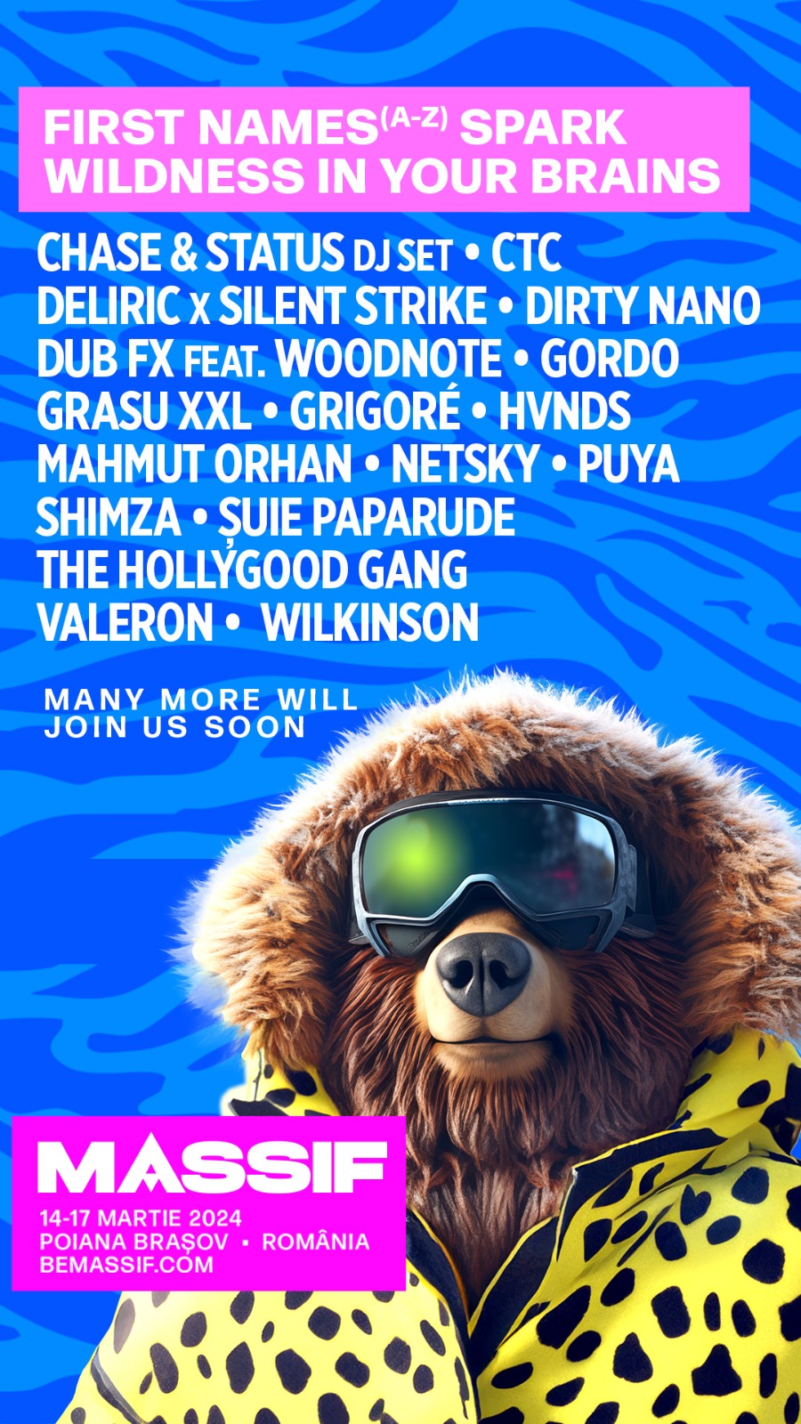 Pentru cea de-a doua ediție, organizatorii Massif adoptă o abordare îndrăzneață, îmbinând cele mai tari activități montane cu diversitatea de genuri muzicale. După primul anunț, pe scenele festivalului Massif vor urca Chase & Status, Mahmut Orhan, Netsky, Valeron, Shimza, GORDO, Wilkinson, Dub FX feat. Woodnote și Grigoré. Alături de ei, cei mai apreciați artiști români se alătură lineup-ului, precum Puya, CTC, Deliric x Silent Strike, Dirty Nano, Grasu XXL, HVNDS, Șuie Paparude și The HollyGood Gang.