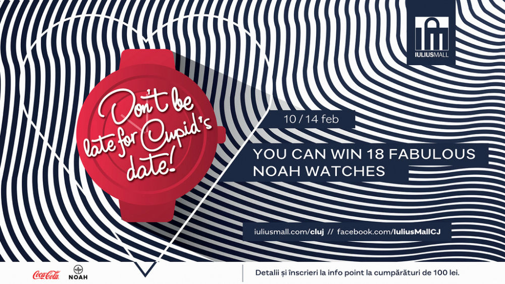 Pe 14 februarie, în intervalul orar 12.00 – 20.00, Cupidon de la Iulius Mall Cluj a stabilit nouă ore și tot atâtea locuri pentru întâlniri pe nepregătite. Fiecare cuplu înscris va primi sms cu invitația jucăușului personaj, în care vor găsi indicii privind coordonatele întâlnirii la care au fost programați. Vor avea la dispoziție o oră și jumătate pentru a ajunge la Iulius Mall și a identifica locul specificat. Atenție! „Don`t be late for Cupid’s date”! Primele trei cupluri care ajung la întâlnire, la ora și locul indicat, se vor întrece pentru a câștiga o pereche de ceasuri Noah, pentru el și pentru ea, pe care le pot personaliza așa cum își doresc. Mai exact, vor trebui să își arate îndemânarea în aruncarea săgeților pe un panou în formă de ceas, iar cei care vor ținti, dintr-o singură încercare, cât mai aproape de ora la care au fost chemați la întâlnire vor fi marii câștigători ai accesoriilor fashion. Perechile mai puțin norocoase, dar care nu au ratat întâlnirea, vor fi răsplătite pentru dragostea lor cu bilete la Cinema City și vouchere la Donuterie.