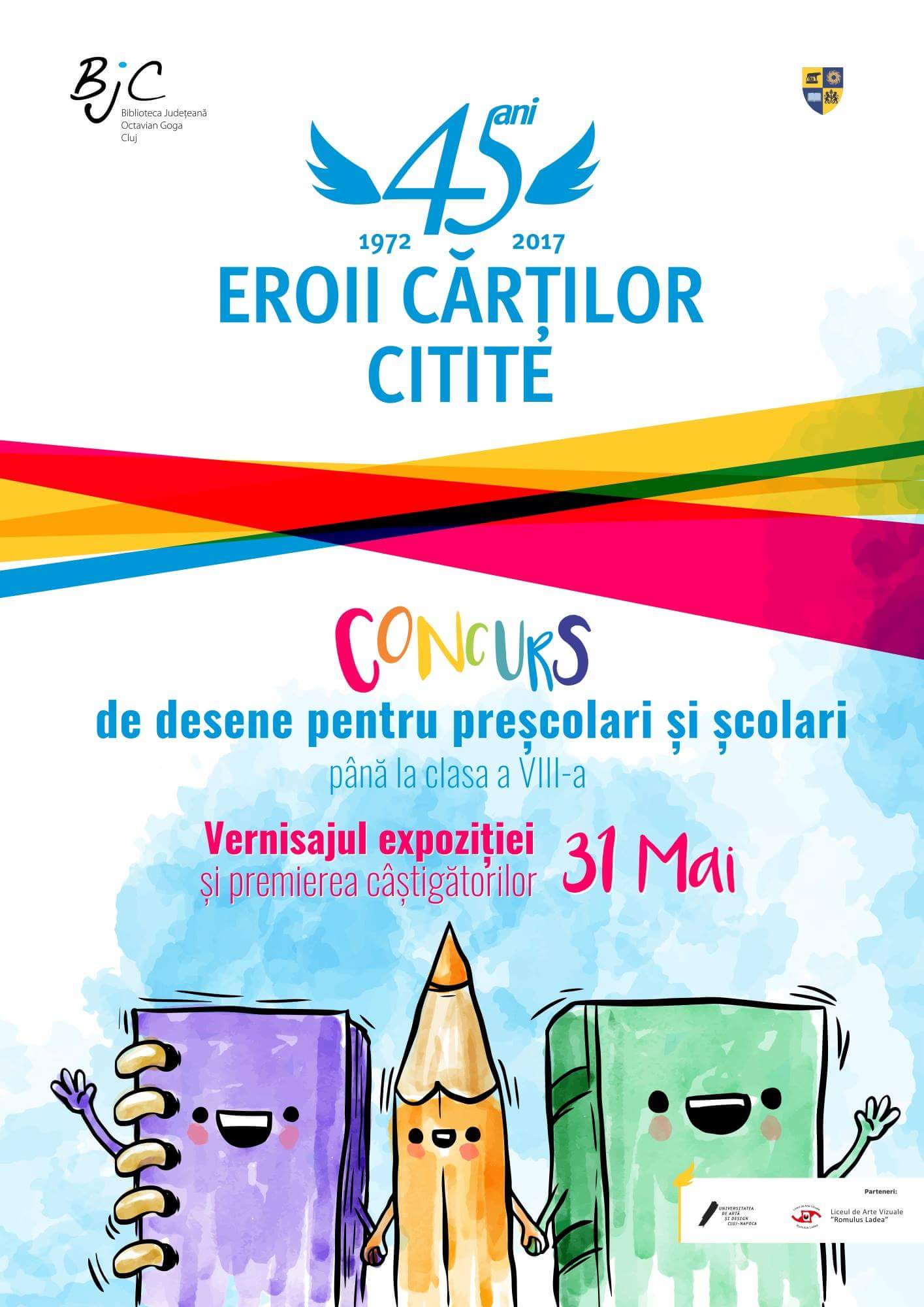 Biblioteca Judeţeană „Octavian Goga” organizează miercuri, 31 mai 2017, ora 13.00, vernisajul expoziţiei şi festivitatea de premiere a ediţiei din acest an a concursului de desene „Eroii cărţilor citite”. Evenimentul va avea loc la Sediul Central al bibliotecii, Calea Dorobanţilor nr. 104, parter, iar expoziţia va fi deschisă pentru public până în data de 16 iunie 2017.