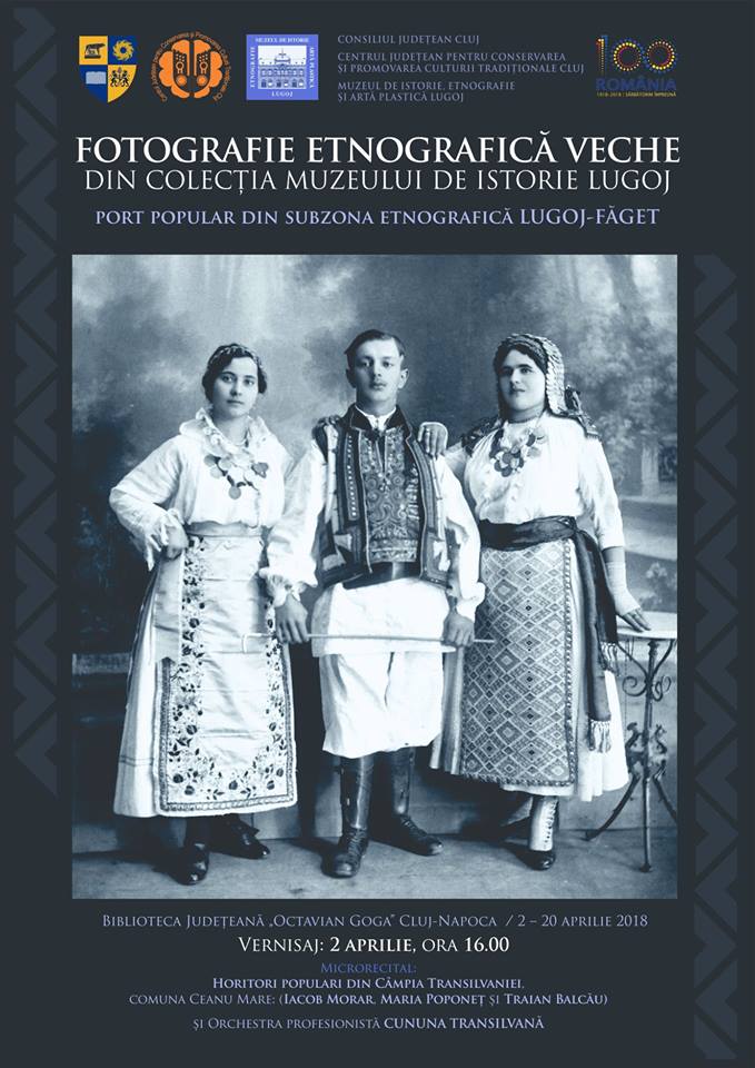 Centrul Județean pentru Conservarea și Promovarea Culturii Tradiționale Cluj invită publicul la vernisajul expoziției de Fotografie etnografică veche, din colecția Muzeului de Istorie Lugoj – „Port popular din subzona etnografică Lugoj-Făget”. Evenimentul va avea loc luni, 2 aprilie a.c., începând cu ora 16.00, la Biblioteca Județeană „Octavian Goga” din Cluj-Napoca, iar expoziția va fi deschisă publicului în perioada 2-20 aprilie 2018.