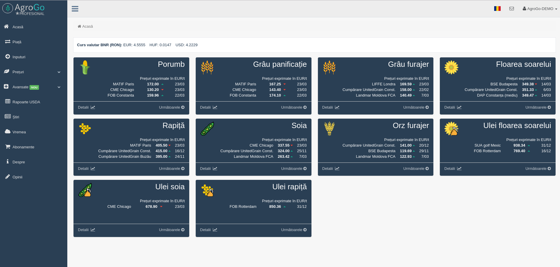 AgroGo oferă informațiile necesare pentru luarea deciziilor în vânzarea și cumpărarea de cereale (prețuri la zi, analize, grafice, știri etc.), și permite tranzacționarea într-un mod organizat a produselor agricole. Prețurile cerealelor sunt obținute de la principalele burse internaționale (MATIF – Paris, CBOT/CME – Chicago ș.a.) și sunt completate de datele obținute de la Ministerul Agriculturii, portul Constanța, precum și de la traderii parteneri, platforma AgroGo prezentând cele mai multe surse de prețuri din țară actualizate periodic.