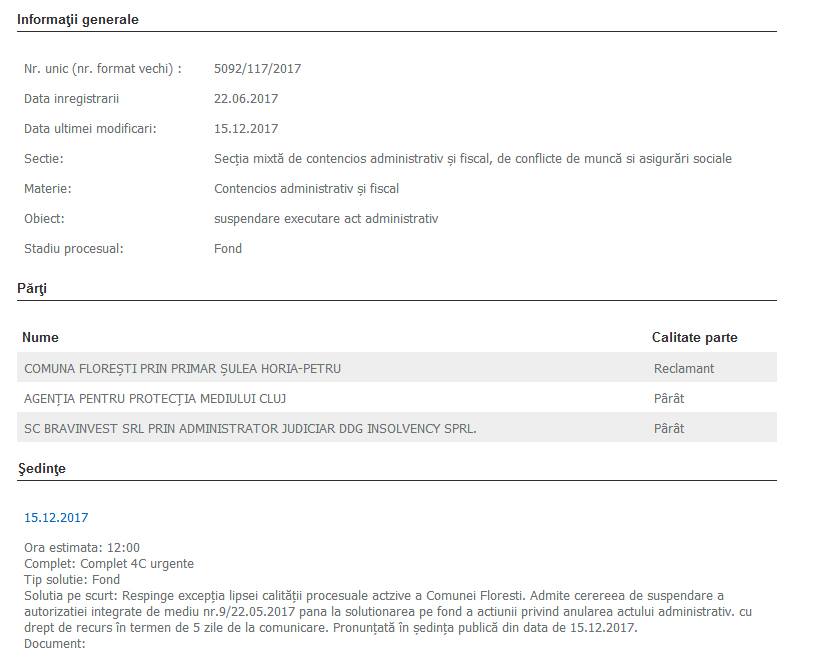 Primarul celei mai mari comune din România, Horia Şulea, a anunţat pe pagina sa personală de Facebook că Tribunalul Cluj a suspendat autorizaţia integrată de mediu emisă de APM Cluj pentru ferma de pui Bravinvest din Floreşti.