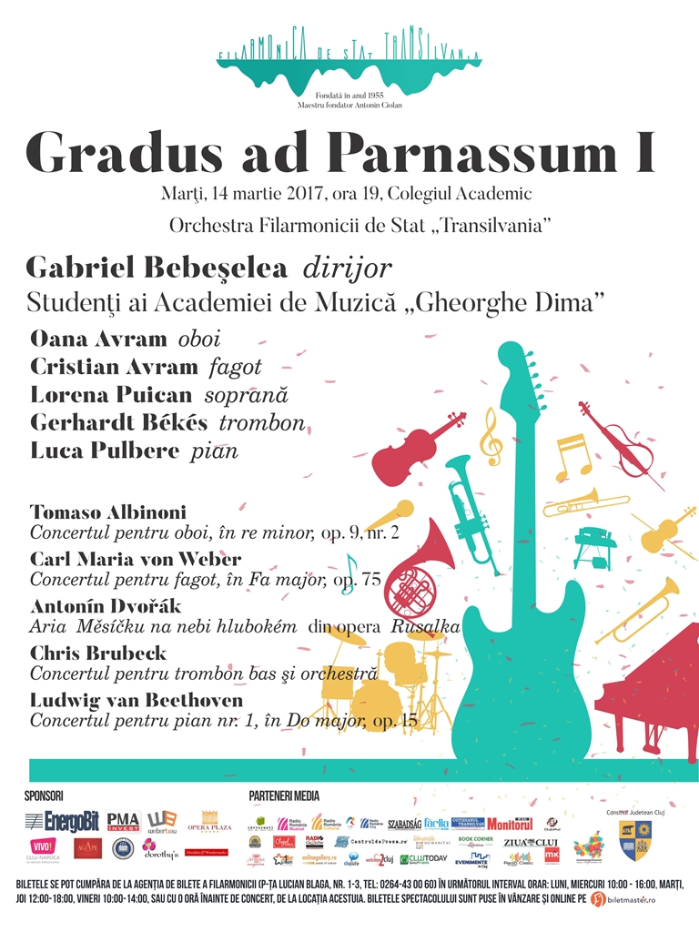 Filarmonica de Stat „Transilvania” susţine în fiecare stagiune tinerele talente şi debutul artistic pe scena muzicii clasice, prin seria de concerte Gradus ad Parnassum. Marţi, 14 martie, de la ora 19, vă invităm în sala Colegiului Academic, la primul concert Gradus ad Parnassum din stagiunea 2016-2017, susţinut de Orchestra Filarmonicii, alături de unii dintre cei mai talentaţi studenţi ai Academiei de Muzică „Gheorghe Dima”: Oana Avram (oboi), Cristian Avram (fagot), Lorena Puican (soprană), Gerhardt Békés (trombon) şi Luca Pulbere (pian).