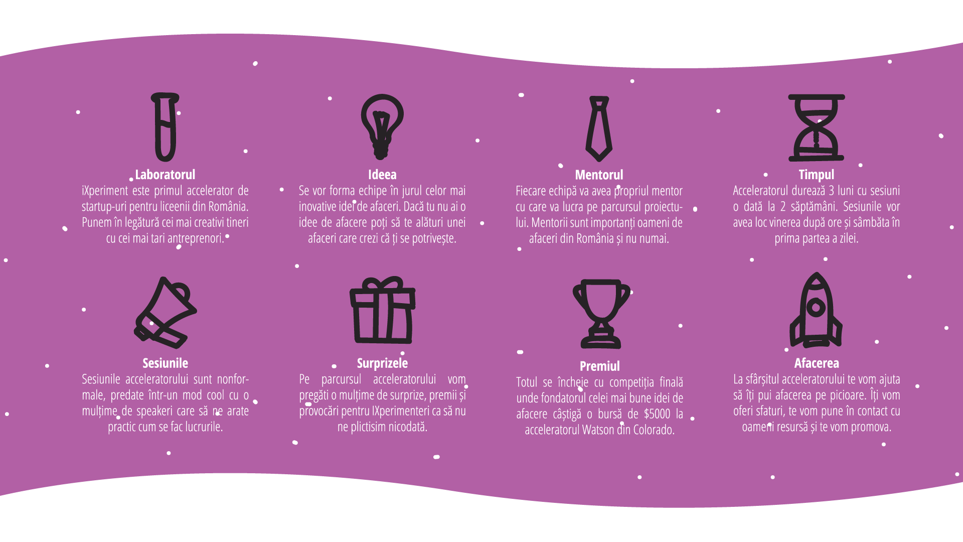 Luna aceasta lansăm o nouă ediție a acceleratorului de start-up-uri – iXperiment 2017. Programul va selecta cei mai inovativi și creativi liceeni din Romania. Lucrând alături de antreprenori de top de la nivel național și internațional, iXperiment-erii vor avea șansa să aplice toate cunoștințele noi dobândite în cadrul programului (antreprenoriat, inovație, tehnologie, marketing, finanțe etc.) pentru a-și lansa propriile afaceri, trecând prin următoarele etape: