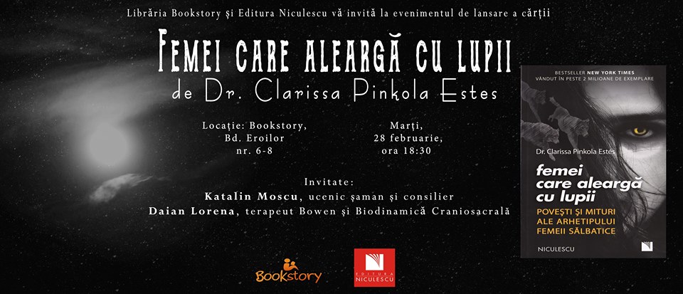 Librăria Bookstory şi Editura NICULESCU vă invită marţi, 28 februarie, ora 18:30 la o seară dedicată cărţii „Femei care aleargă cu lupii”, scrisă de Dr. Clarissa Pinkola Estes.