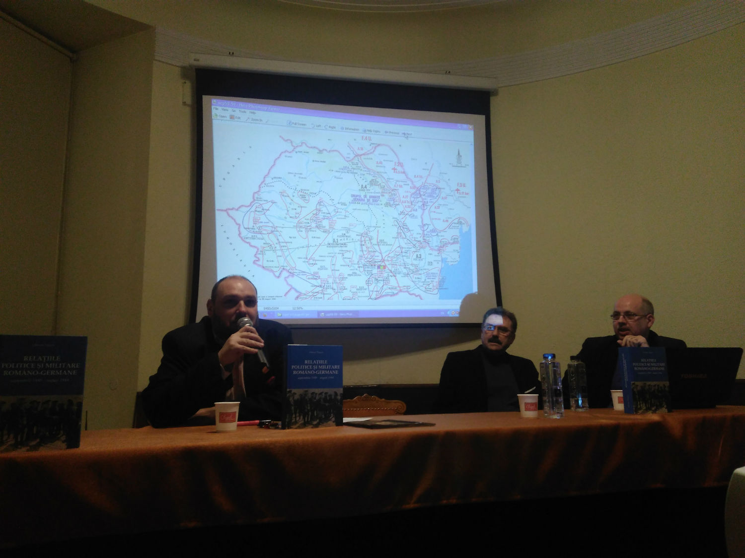 În faţa unei săli pline interesate de această parte a istoriei româneşti, o parte în care Regele Mihai I la demis şi arestat pe Ion Antonescu la 23 august 1944, profesorul Ottmar Traşcă a vorbit cu lux de amănunt despre relaţiile dintre România şi Germania, respectiv Uniunea Sovietică, prezentând o serie de imagini şi hărţi cu mişcările de trupe care au avut loc în acea perioadă, iar la final a dialogat cu publicul.