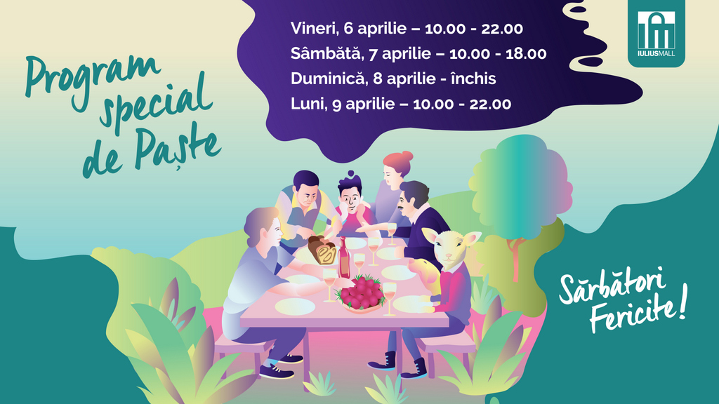 Cei care se pregătesc încă pentru masa de Paște sau își doresc noi ținute pentru sărbătorile ce se apropie vor găsi magazinele din Iulius Mall Cluj deschise și vineri, 6 aprilie 2018, după programul normal: 10.00 – 22.00. Sâmbătă, mall-ul va funcționa până la ora 18.00, iar duminică, în prima zi de Paște, magazinele vor fi închise.