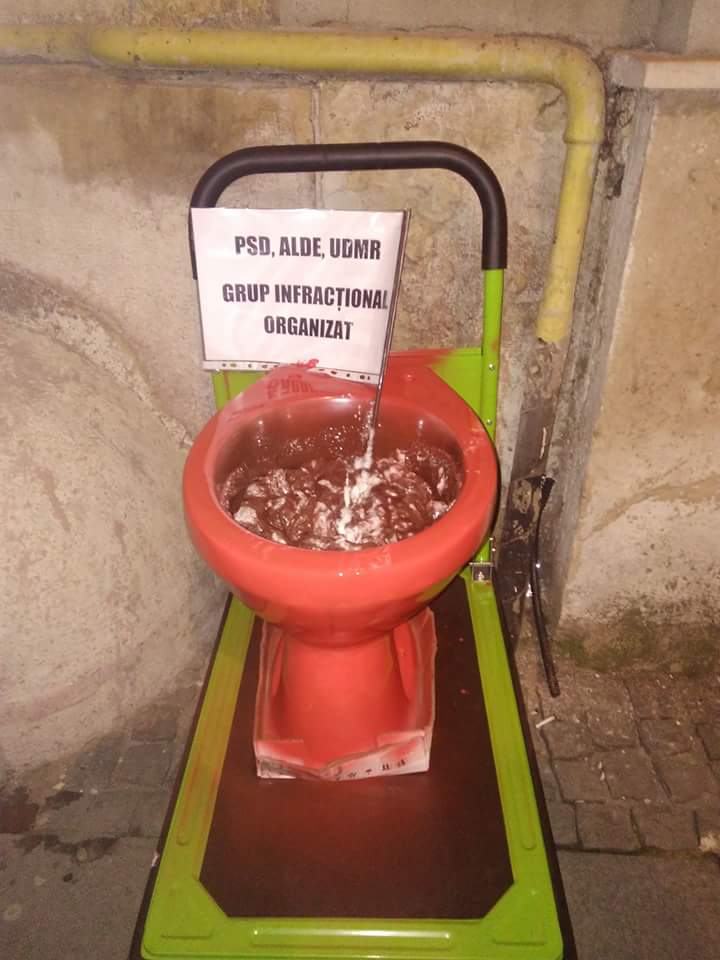 Un moment inedit a fost când un protestatar a venit cu o toaletă și a vopsit-o în roșu, care a fost purtată pe un cărucior în fruntea marșului având mesajul: „PSD, ALDE și UDMR – grup infracțional organizat”.