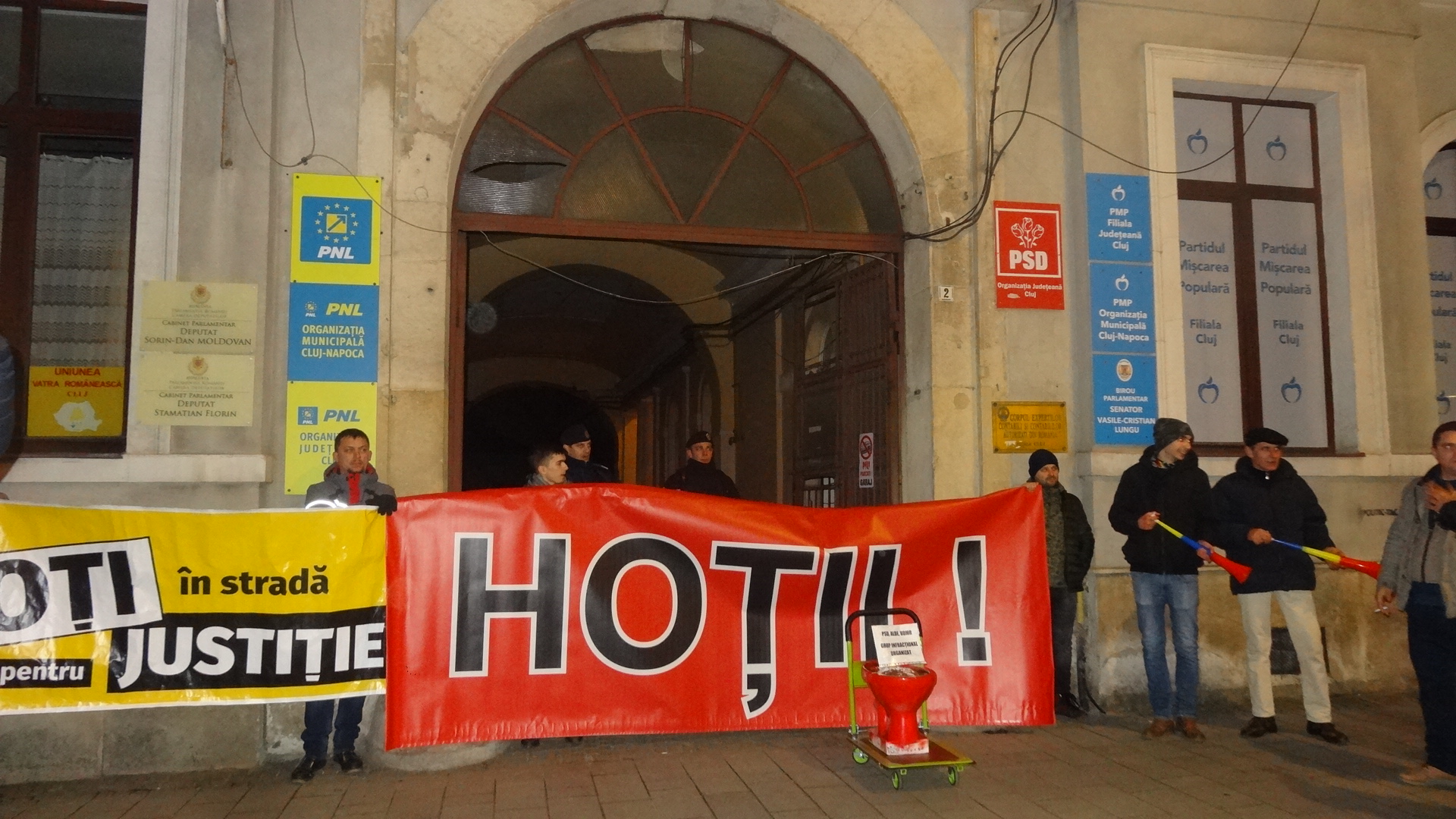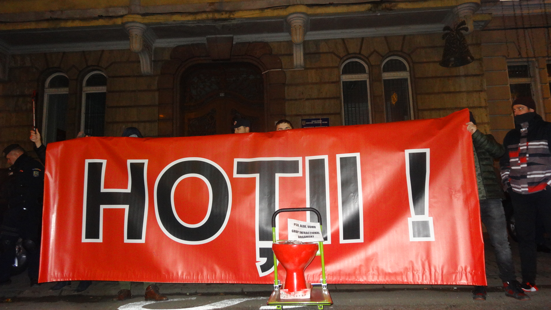 În faţa Prefecturii manifestanţii au strigat „Hoţii, hoţii” şi „Retrageţi legile”.