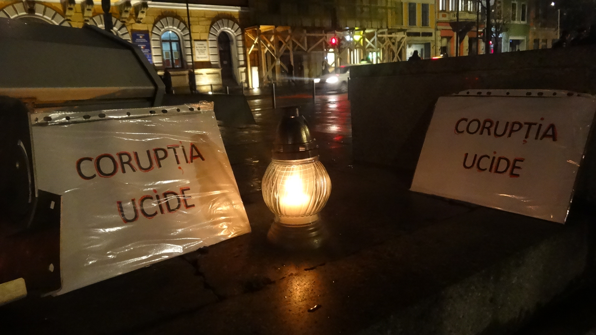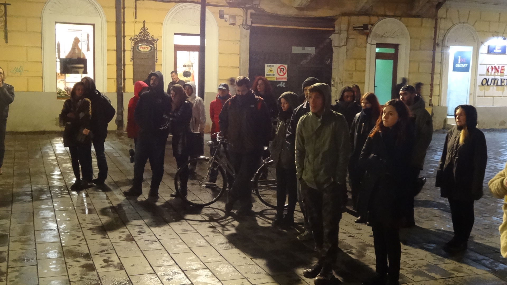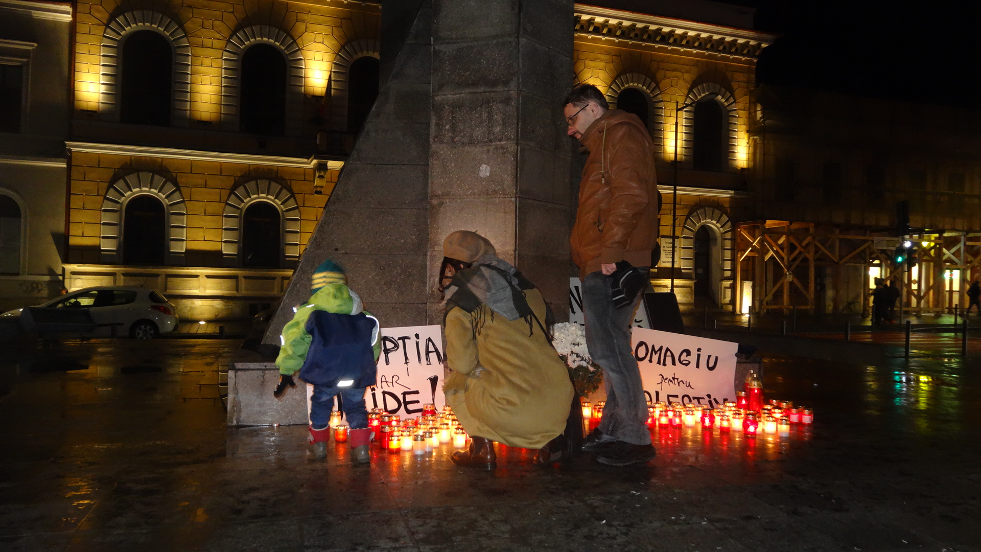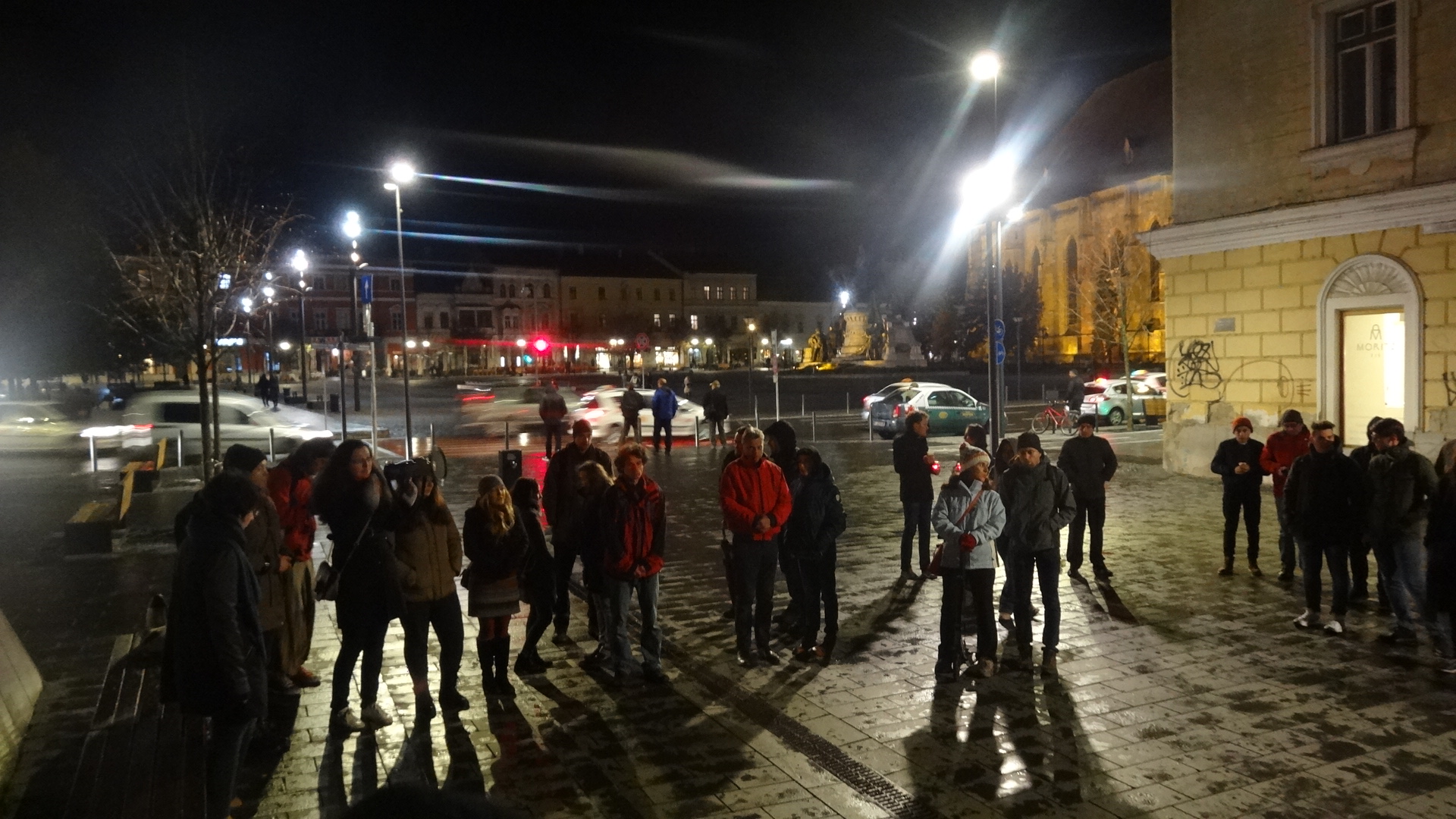 Câteva zeci de clujeni nu au uitat de cei care nu mai sunt printre noi şi de cei care suferă chiar şi după 2 ani de la tragedia care a îndoliat o ţară întreagă pe 30 octombrie 2015 şi au venit să ia parte la acest eveniment comemorativ. Nelipsite au fost şi bannerele cu „Corupţia ucide”, „Nouă ne pasă” şi „Omagiu pentru Colectiv”.