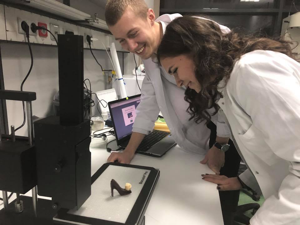 Studenții voluntari ai Facultății de Știința și Tehnologia Alimentelor din cadrul USAMV Cluj, Napoca, Amalia Nemeș și Alexandru Szabo, au realizat, în premieră la universitatea noastră, un pantof de ciocolată cu ajutorul unei imprimante 3D. Ei au lucrat timp de câteva ore la proiect, fiind supervizați de doctoranda Gabriela Precup.