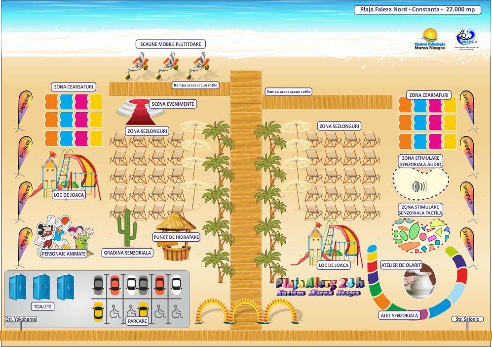 Parcul terapeutic, întins pe 22.000 de metri pătraţi de plajă, va cuprinde două zone de șezlonguri (100 de locuri), două zone de cearșafuri (1.000 de locuri), rampe de acces speciale pentru persoanele cu dizabilităţi, o scenă pentru evenimente, o grădină senzorială de relaxare, un punct de hidratare, două locuri de joacă, o zonă de stimulare auditivă și una de stimulare vizuală și tactilă, un spaţiu de terapie canină, o alee senzorială, un atelier de olărit, scaune mobile plutitoare pentru persoanele cu dizabilități și un cort de prim ajutor.