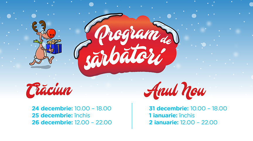 Lista de cumpărături pentru Crăciun este incompletă? Magazinele Iulius Mall Cluj te așteaptă să le colinzi și în Ajun, până la ora 18.00. Pe 25 decembrie mall-ul va fi închis, dar pe 26 decembrie se dă startul la shopping și distracție începând cu ora 12.00, până la ora 22.00.