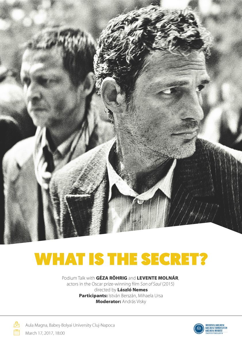 Linia maghiară a Facultății de Litere din cadrul Universităţii Babeş-Bolyai, împreună cu Departamentul de Literatură maghiară și Federația Universitară Maghiară din România, organizează vineri, 17 martie 2017, de la ora 18.00, o masă rotundă intitulată „What’s the secret?”, la care vor participa Géza Röhrig (New York) și Levente Molnár (Teatrul Maghiar din Cluj), protagoniștii filmului Fiul lui Saul, regizat de László Nemes şi distins cu Premiul Oscar pentru cel mai bun film străin.