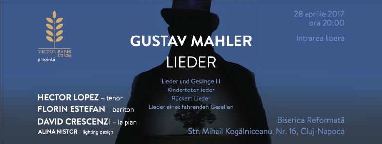 Tenorul Hector Lopez și baritonul Florin Estefan, acompaniați la pian de maestrul David Crescenzi, invită clujenii la un recital extraordinar de lieduri Gustav Mahler. Evenimentul muzical are loc mâine, vineri, 28 aprilie, de la ora 20.00, la Biserica Reformată de pe strada Mihail Kogălniceanu nr. 16, iar intrarea este gratuită.