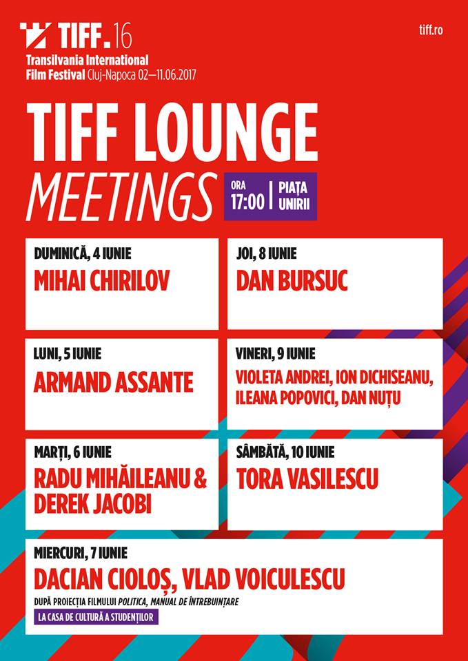 Duminică, pe 4 iunie, de la ora 17.00, Mihai Chirilov, directorul artistic TIFF, a inaugurat TIFF Lounge povestind despre filmele ediției cu numărul 16. Luni, pe 5 iunie, vine la TIFF Lounge celebrul actor american Armand Assante, cu doar două ore înainte de premiera mondială The Wanderers (r. Dragoș Buliga), care va avea loc la Cinema Florin Piersic, de la 19:15, în prezența echipei. Marți, pe 6 iunie, gazdele jurnalistului Mihnea Măruță vor fi regizorul Radu Mihăileanu și actorul britanic Derek Jacobi, care vor aduce detalii din culisele filmului Povestea iubirii, care are premiera în România pe 5 iunie, de la 21:45, în Piața Unirii Open Air. Miercuri, pe 7 iunie, dezbaterea se va muta la Casa de Cultură a Studenților, după proiecția Politica, manual de întrebuințare (r. Fernando León de Aranoa) programată la ora 15:00. Invitați: fostul premier Dacian Cioloș și fostul ministrul sănătății, Vlad Voiculescu.