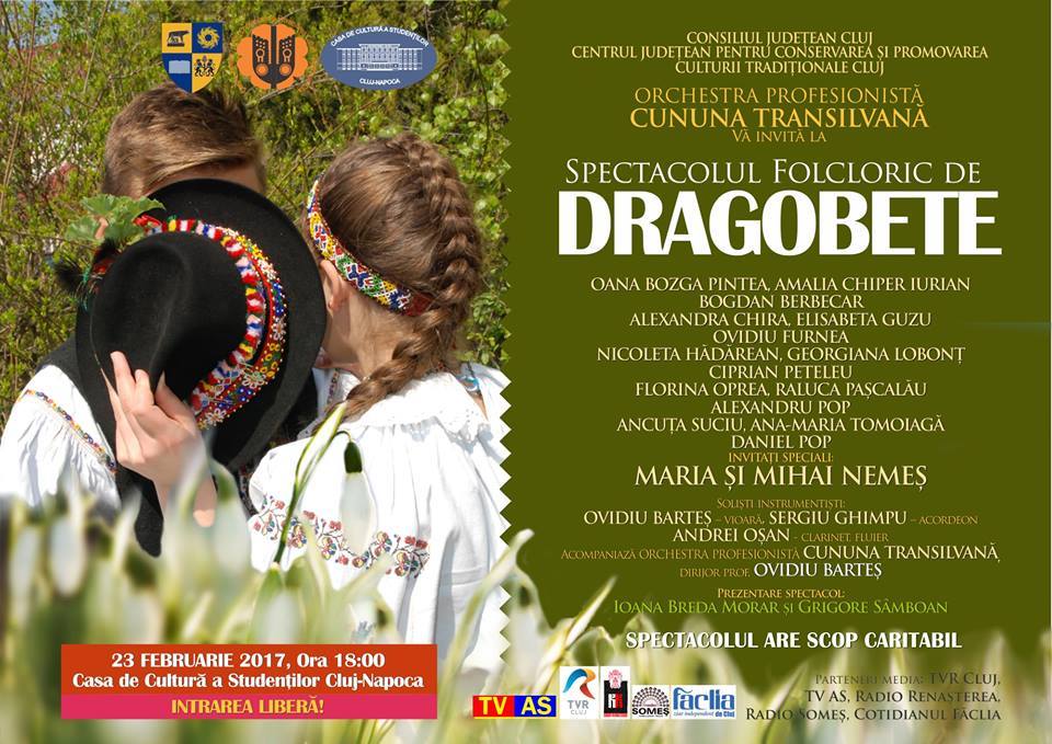 Cele mai frumoase cântece de dragoste vor fi aduse în fața publicului clujean de tineri interpreți de folclor din zona Transilvaniei, joi, 23 februarie 2017, de la ora 18:00, în sala de spectacole „Dumitru Fărcaș” a Casei de Cultură a Studenților din Cluj-Napoca. Aceasta în cadrul spectacolului folcloric de Dragobete, organizat de Centrul Judeţean pentru Conservarea şi Promovarea Culturii Tradiţionale Cluj, instituție de cultură aflată în subordinea Consiliului Judeţean Cluj.
