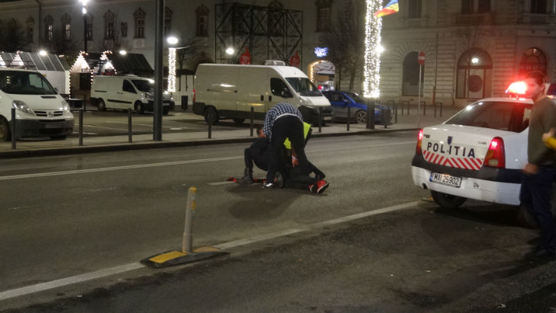 Un echipaj de poliţie a sosit prompt la faţa locului şi a fost nevoit să îl imobilizeze, cu greu, pe tânărul agresiv şi să îl ducă la secţie. La un moment dat, tânărul aflat sub influenţa alcoolului a devenit agresiv chiar şi cu oamenii legii, care s-au chinuit să îl reţină.