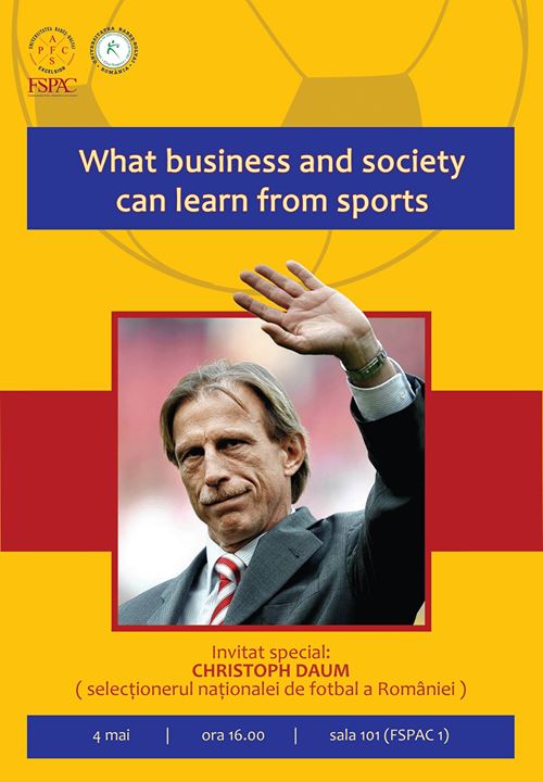 Christoph Daum, selecționerul echipei naționale de fotbal a României, va ajunge joi, 4 mai, de la ora 16.00, în sala 101 a Facultății de Științe Politice și Admistrative și ale Comunicării (FȘPAC) 1 (str. Traian Moșoiu, nr.71), unde va discuta despre ce se poate învăța din sport, cu aplicabilitate în alte domenii.