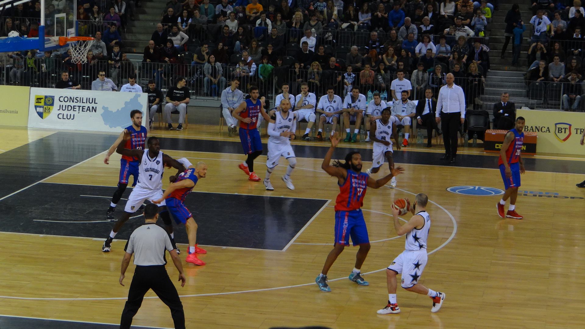 Meciul a fost extrem de echilibrat în prima parte, dar cu gazdele aflate în permanență la cârma jocului. Steliştii au reuşit o singură dată să preia iniţiativa pe tabelă, la mijlocul perioadei (scor 10-13), însă un run de 8-0 al clujenilor ne-au adus un avantaj pe care de altfel a fost și păstrat până la finalul primului sfert.