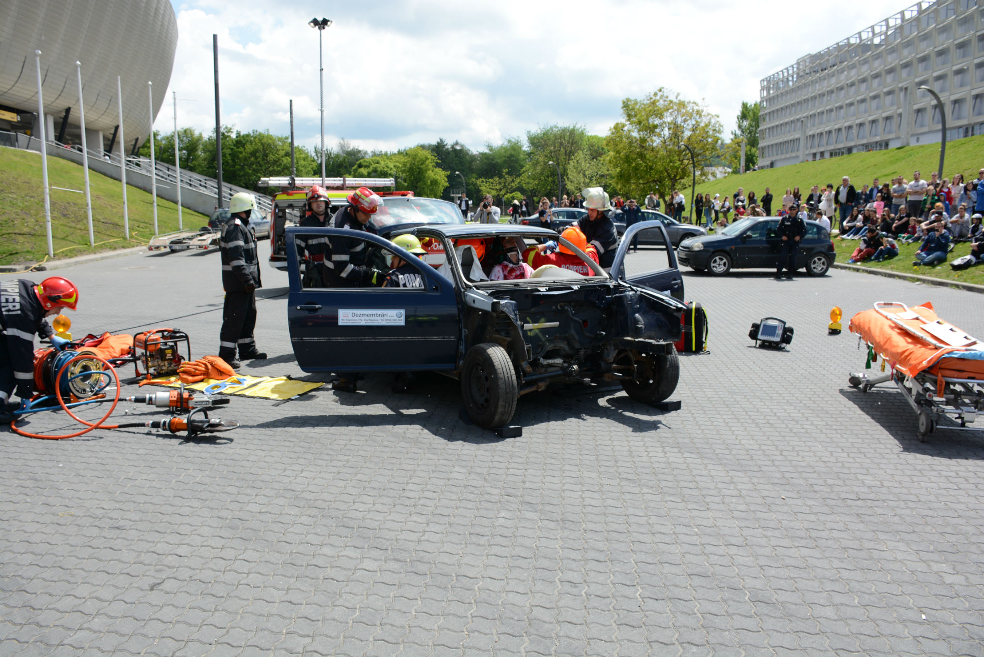 Astfel, pe platoul Cluj Arena a fost simulat un accident de circulaţie, fiind desfăşurată o adevărată operaţiune de descarcerare şi salvare a victimelor.