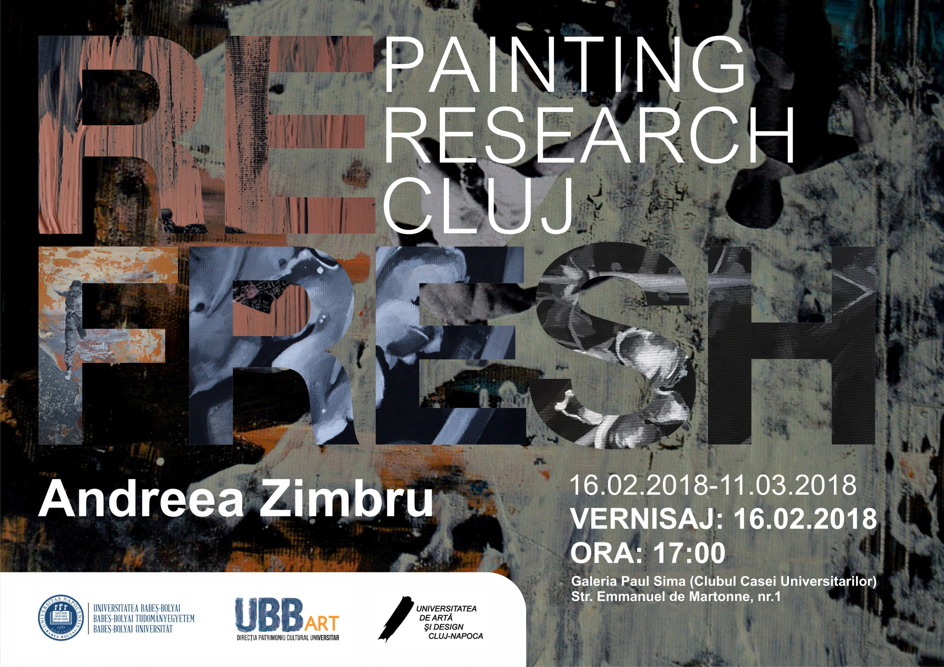Galeria de artă „Paul Sima” a Universităţii Babeş-Bolyai, în parteneriat cu Universitatea de Artă şi Design din Cluj-Napoca, vă invită la un nou vernisaj de pictură contemporană clujeană, în cadrul Galeriei urmând să fie prezentate o serie de lucrări ce aparţin artistei Andreea Zimbru, doctorand în arte vizuale.