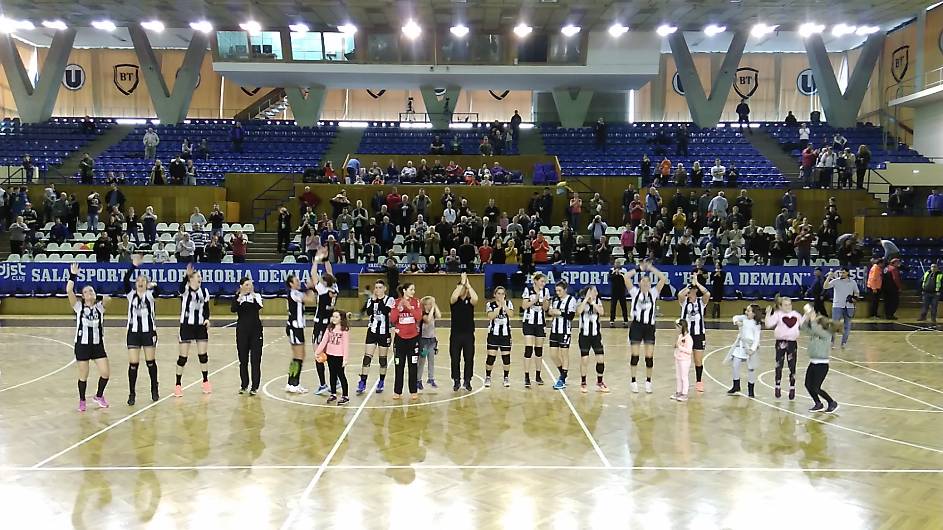 Încurajate frenetic de un public euforic care a cântat pe toată durata partidei, cum numai în Sala Sporturilor „Horia Demian” mai găseşti o asemenea atmosferă, handbalistele clujence au avut un avantaj de cinci goluri şi au reuşit să ţină Slatina la distanţă pe tabelă.