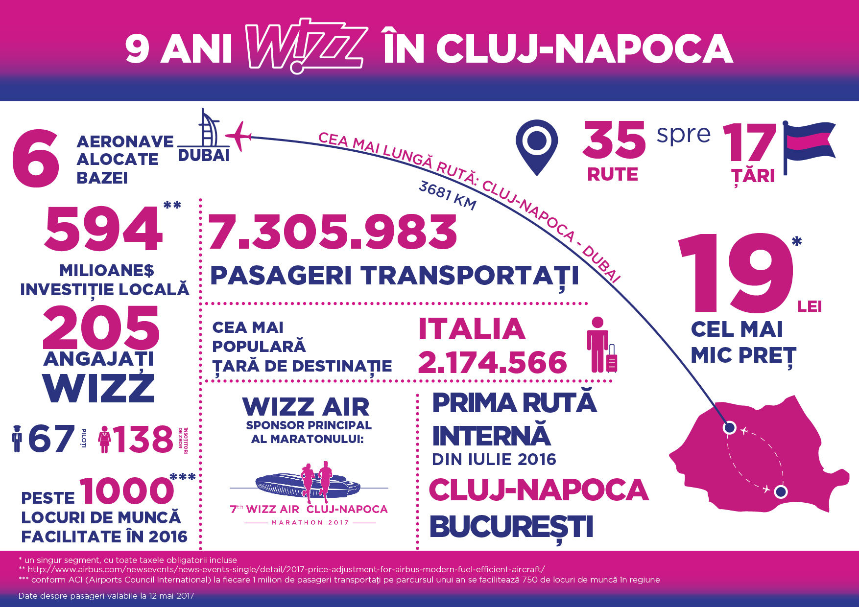 În calitate de linie aeriană principală a oraşului, Wizz Air şi-a câştigat încrederea şi loialitatea a peste 7,3 milioane de pasageri de la începutul operaţiunilor sale pe Aeroportul Internaţional Avram Iancu. Anul trecut, mai mult de 1,3 milioane de pasageri s-au bucurat de preţurile scăzute WIZZ, de sistemul de rezervare facil, precum şi de serviciile excelente la bord din şi spre Cluj-Napoca. Compania susţine peste 1.000 de locuri de muncă**** locale în industriile de aviaţie şi de turism.