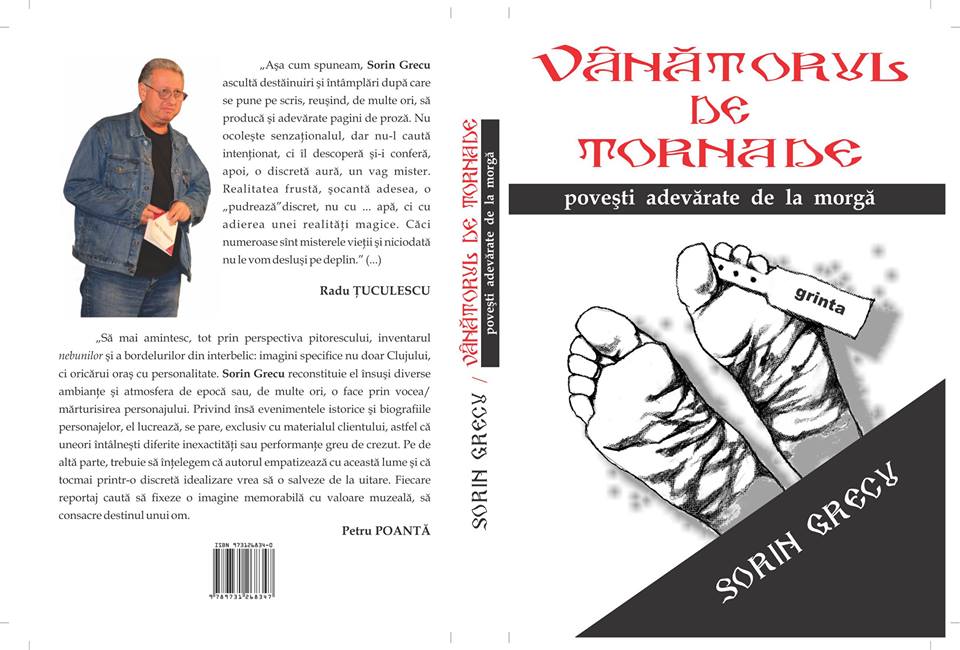 Unul dintre cei mai vechi jurnalişti clujeni, Sorin Grecu, îşi lansează cea de-a unsprezece carte a sa, „Vânătorul de tornade – povestiri adevărate de la Morgă”, însumând 100 de scurte povestiri şi reportaje. Poveşti în marea lor majoritate triste dar, de multe ori, pigmentate de un umor involuntar, absurd – generat de diversitatea situaţiilor întâlnite – semn că de cele mai multe ori viaţa depăşeşte orice ficţiune, cât ar fi ea de meşteşugită!