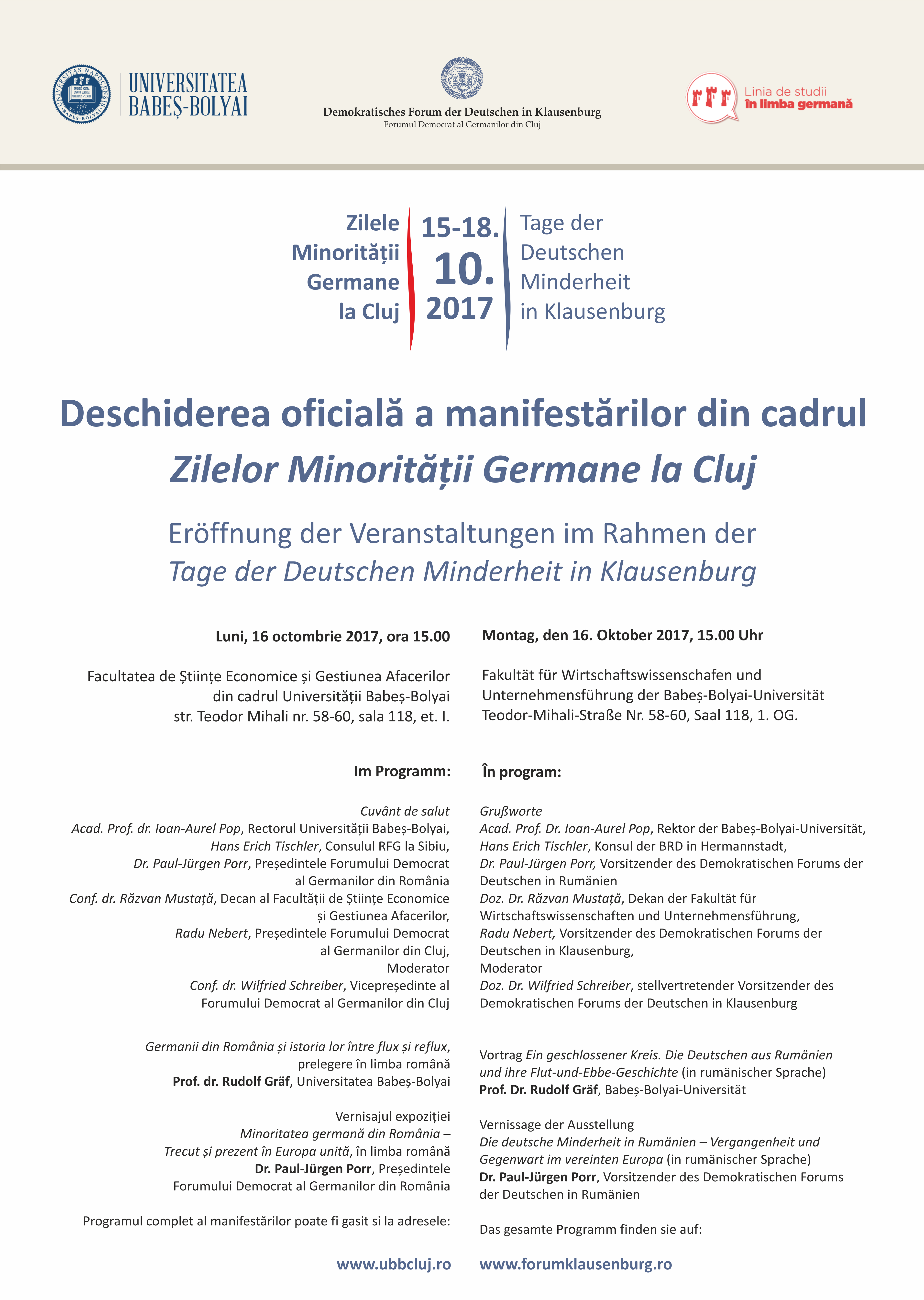 Universitatea Babeș-Bolyai va găzdui luni, 16 octombrie 2017, cu începere de la ora 15.00, la sediul Facultății de Științe Economice și Gestiunea Afacerilor (FSEGA – str. Teodor Mihali nr. 58-60), o serie de manifestări dedicate Zilelor Minorității Germane la Cluj.
