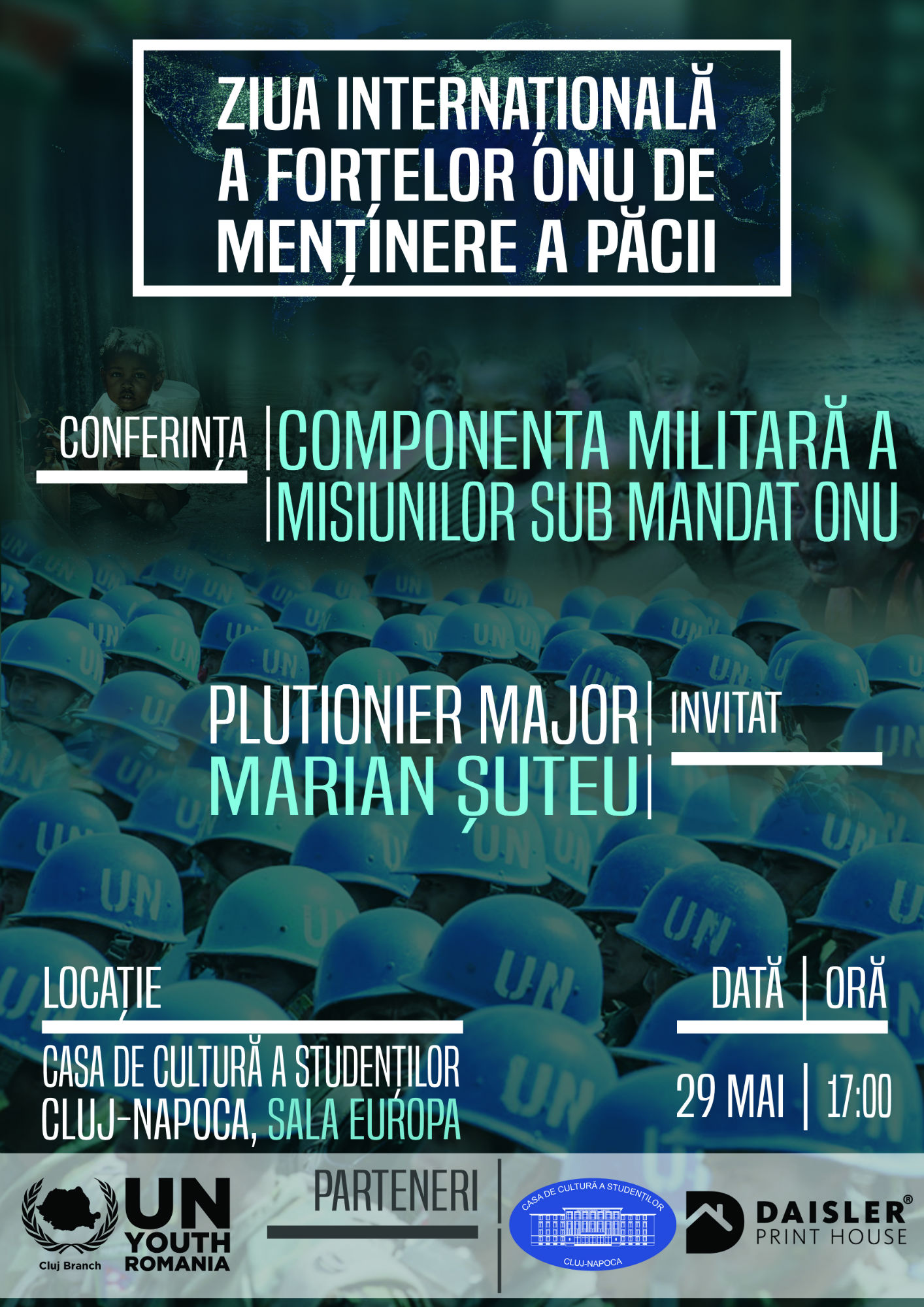 Evenimentul va avea loc luni, 29 mai, în sala Europa a Casei de Cultură a Studenților cu ocazia Zilei Internaționale a Forțelor ONU de Menținere a Păcii. Invitatul si speaker-ul conferinței este Plutionier Major Marian Șuteu, care va aborda subiectul evenimentului atât din punct de vedere istoric, cât și personal, ca urmare a intervențiilor sale în zonele de conflict din Angola din perioada 1996, 1997, respectiv 1998.